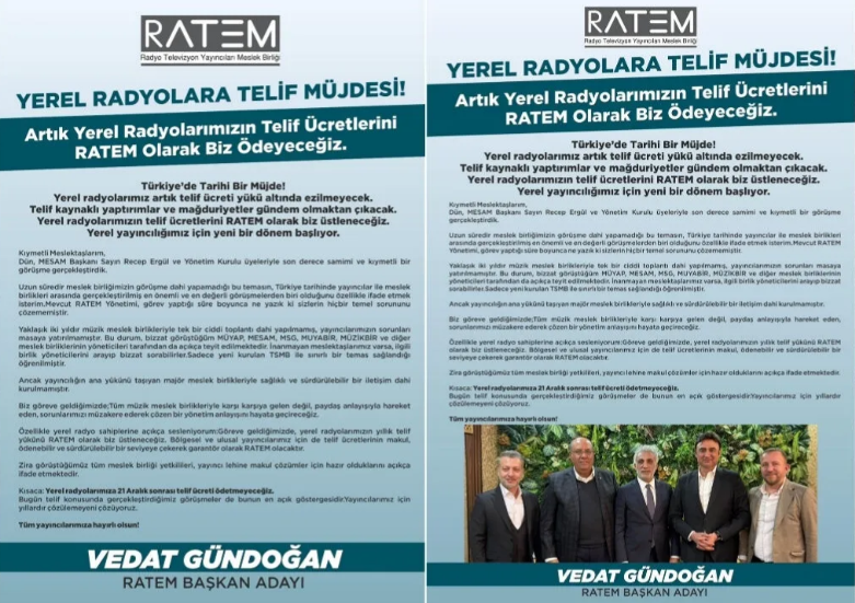“Yerel radyolarımızın yıllık telif ücretini RATEM olarak biz üstleneceğiz. Bölgesel ve ulusal yayıncılar için ise telif bedelleri makul, ödenebilir ve sürdürülebilir seviyelere çekilecek. Bu süreçte RATEM garantör olacak.”