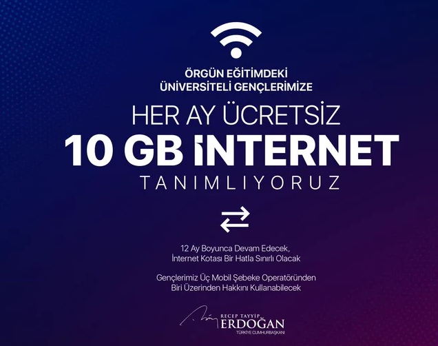 Bir hatla sınırlı olmak üzere 12 ay boyunca aylık ücretsiz 10 GB kota tanımlıyoruz. Gençlerimiz bu haklarını istedikleri üç mobil şebeke operatörlerinin üzerinden kullanabilecekler. Üniversiteli gençlerimizin teknoloji ve bilgiye erişimini artıracağız. Her iki desteğe ilişkin uygulama esasları bakanlıklarımızca belirlenecektir.