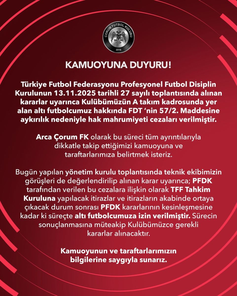 “Türkiye Futbol Federasyonu Profesyonel Futbol Disiplin Kurulunun 13.11.2025 tarihli 27 sayılı toplantısında alınan kararlar uyarınca Kulübümüzün A takım kadrosunda yer alan altı futbolcumuz hakkında FDT 'nin 57/2. Maddesine aykırılık nedeniyle hak mahrumiyeti cezaları verilmiştir.