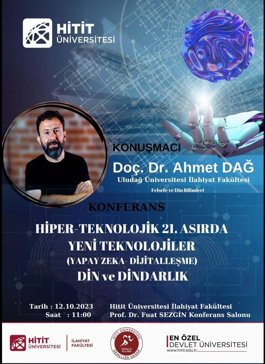 Çorum Hitit Üniversitesi İlahiyat Fakültesi Fuat Sezgin konferans salonunda, "Hiper Teknolojik 21. Asırda Yeni Teknolojiler, Din ve Dindarlık" konulu konferansa ev sahipliği yaptı.Bursa Uludağ Üniversitesi İlahiyat Fakültesi Öğretim Görevlisi Doç. Dr. Ahmet Dağ, "Yapay Zeka İnsan Zihninin Taklididir.Müslümanlar olarak teknoloji,bilgilendirme ve tebliğ dünyasında olmalıyız"