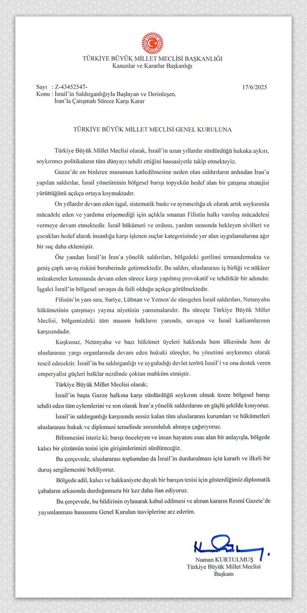 Türkiye Büyük Millet Meclisi Genel Kurulu’nda, İsrail'in saldırgan politikalarıyla başlayan ve İran’a yönelik çatışmaları da kapsayan sürece ilişkin önemli bir adım atıldı. TBMM Başkanı Numan Kurtulmuş’un imzasını taşıyan tezkere, oy birliğiyle kabul edildi.