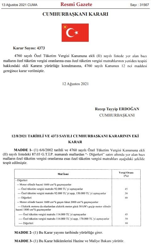 Cumhurbaşkanlığı Kararı'nda şu ifadeler yer aldı: "4760 sayılı Özel Tüketim Vergisi Kanununa ekli (II) sayılı listede yer alan bazı malların özel tüketim vergisi oranlarına esas özel tüketim vergisi matrahlarının yeniden tespiti hakkındaki ekli Kararın yürürlüğe konulmasına, 4760 sayılı Kanunun 12'nci maddesi gereğinde karar verilmiştir.