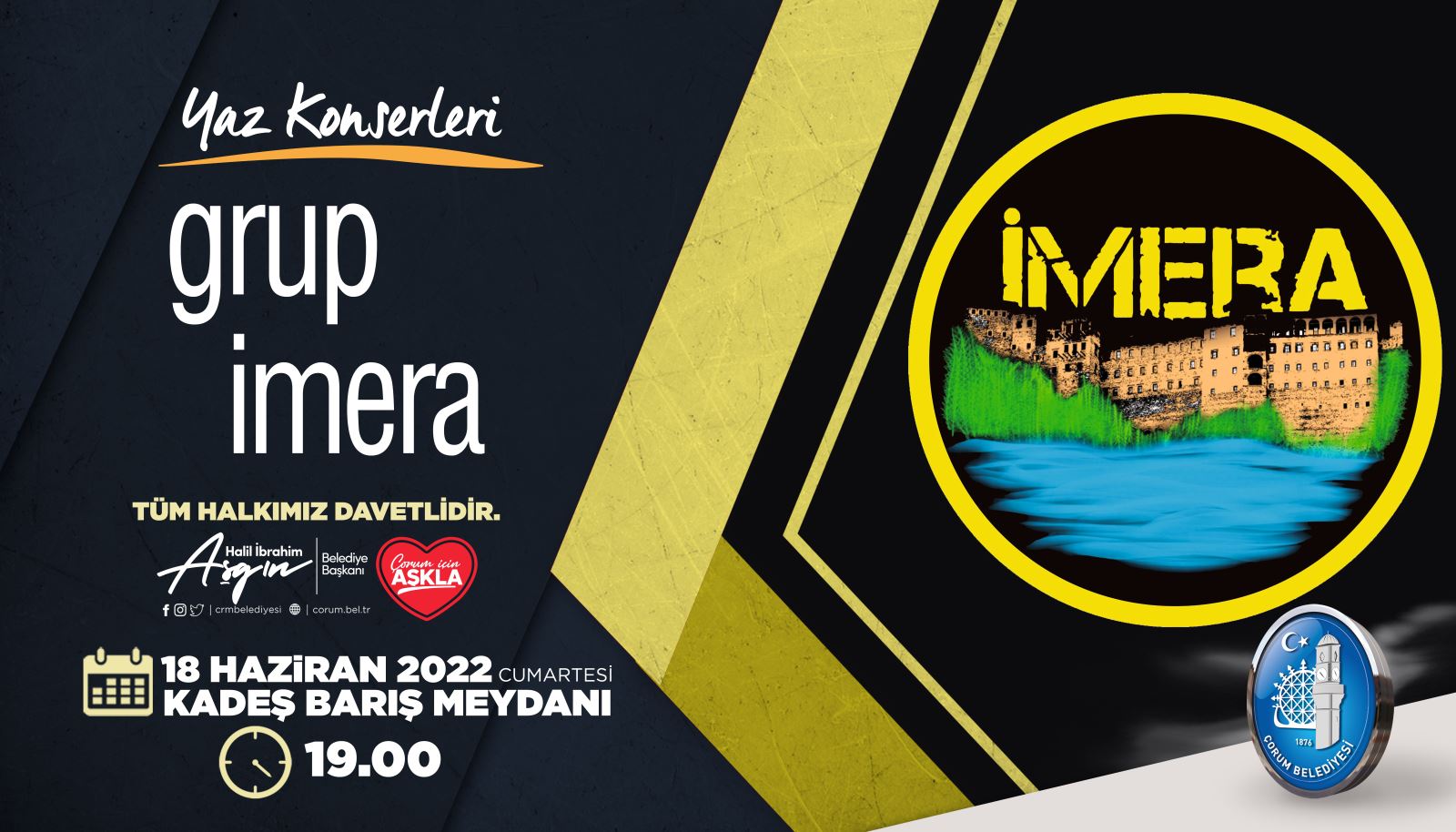 Çorumluların büyük ilgi gösterdikleri yaz konserlerinin bu haftaki konuğu Grup İmera olacak. Çorum Belediye Başkanı Dr. Halil İbrahim Aşgın, 18 Haziran Cumartesi akşamı saat 20.30’da Kadeş Barış Meydanı'nda düzenlenecek halk konserine tüm vatandaşları davet etti.