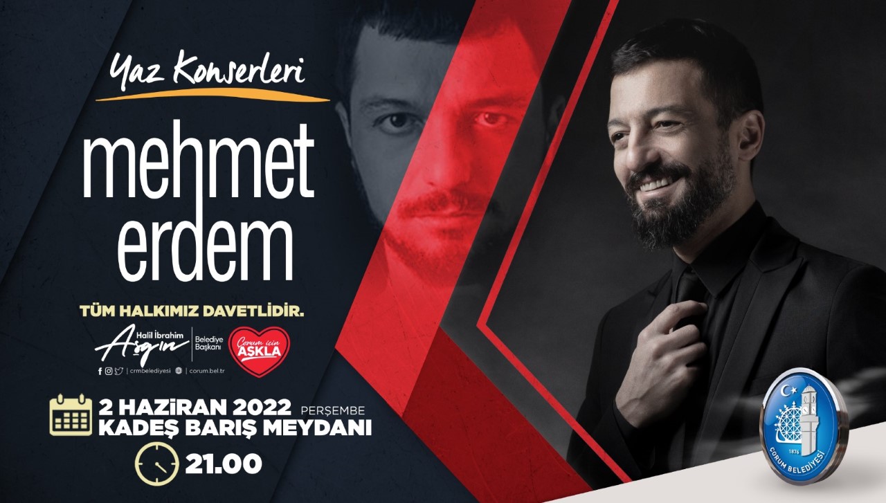 Kültür-sanat etkinliklerine devam eden Çorum Belediyesi, ‘’Yaz Konserleri’’ etkinliği kapsamında Mehmet Erdem konseri düzenliyor. Sevilen ve gençlerin yakından takip ettiği ünlü sanatçı Mehmet Erdem, Çorumlulara unutulmaz bir gün yaşatacak. 2 Haziran Perşembe günü saat 21.00’de Kadeş Barış Meydanı’nda düzenlenecek konser tüm vatandaşlara ücretsiz olacak.“Bu yaz Çorum konsere doyacak, gençler doyasıya eğlenecek” diyen Belediye Başkanı Dr. Halil İbrahim Aşgın, tüm vatandaşları konsere davet etti.